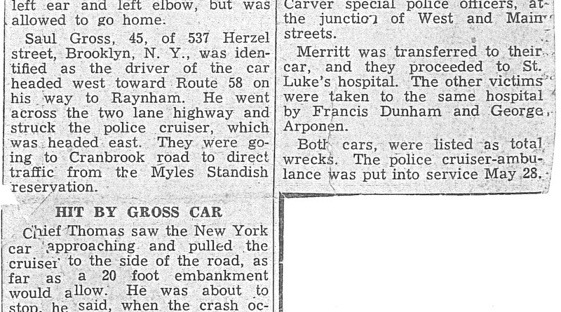 History Left-to-right Chief Dana Thomas & Wife Pauline, Bud Bryant & Wife Esther, Ray Parent & Wife Kathy, Warren Robertson & Wife Sally, Bud Bisbee & Wife Glady, David Nye Officer Anthony Luca Carver Police Officers Carver Police Officers 1960 Police Ball CPD Officers circa 1975 Chief Dana Thomas CPD Cruiser 1957 1957 Ford Cruiser Hit on Tremont Street Police Cruiser accident Article Chief Dana Thomas 1957 Ford Cruiser Hit on Tremont Street Chief Orr